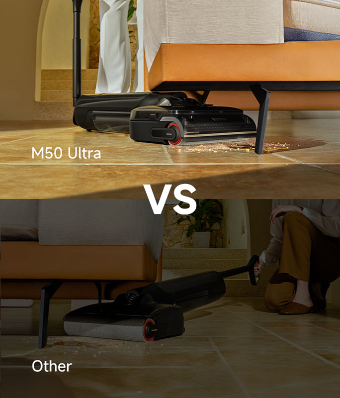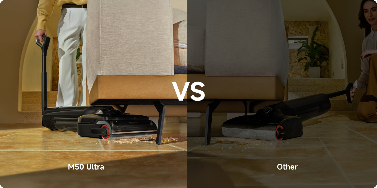 Dzięki technologii EdgeCoverage™ AI, odkurzacz M50 Ultra wyposażono w ramię robota umieszczone z przodu urządzenia. Ramię to aktywnie wysuwa ściągaczke, aby dotrzeć do szczelin wzdłuż krawędzi ściany, co pozwala na dokładne czyszczenie krawędzi bez żadnych luk. Podczas ruchu do tyłu, ramię robota szybko opuszcza się, jednocześnie dociskając do podłogi. W tym samym czasie, odkurzacz do pracy na mokro i sucho usuwa resztki wody, nie pozostawiając prawie żadnych plam.