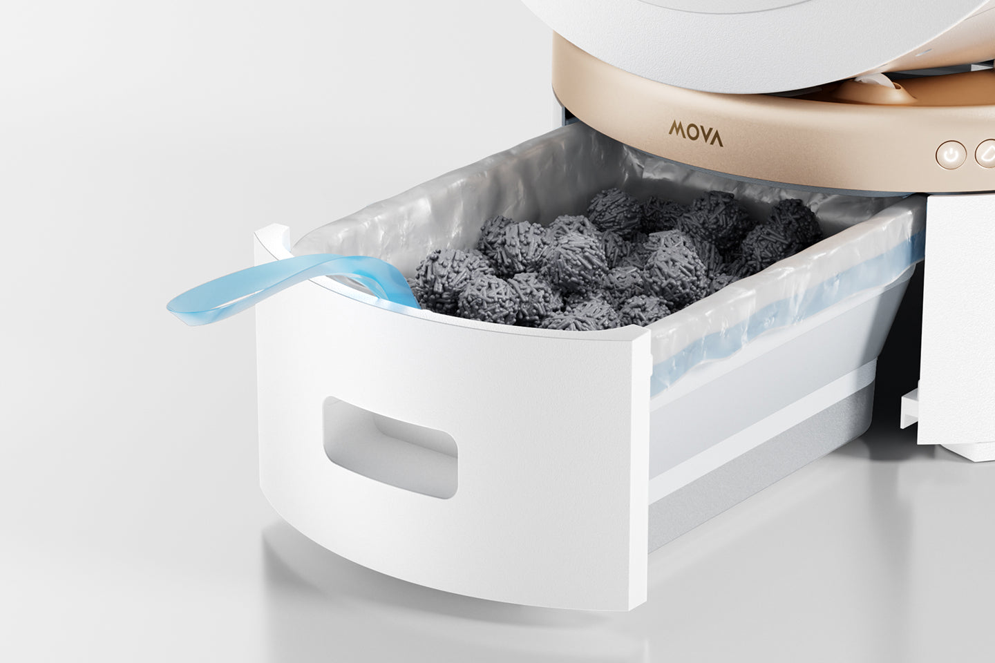 Uchwyt umieszczony na górze pozwala wyjąć bęben jednym, prostym pociągnięciem. Plastikowy bęben oraz misę na żwirek można opłukać w kilka sekund, a następnie szybko zatrzasnąć z powrotem na miejsce – wszystko to bez kontaktu dłoni z kocimi nieczystościami.