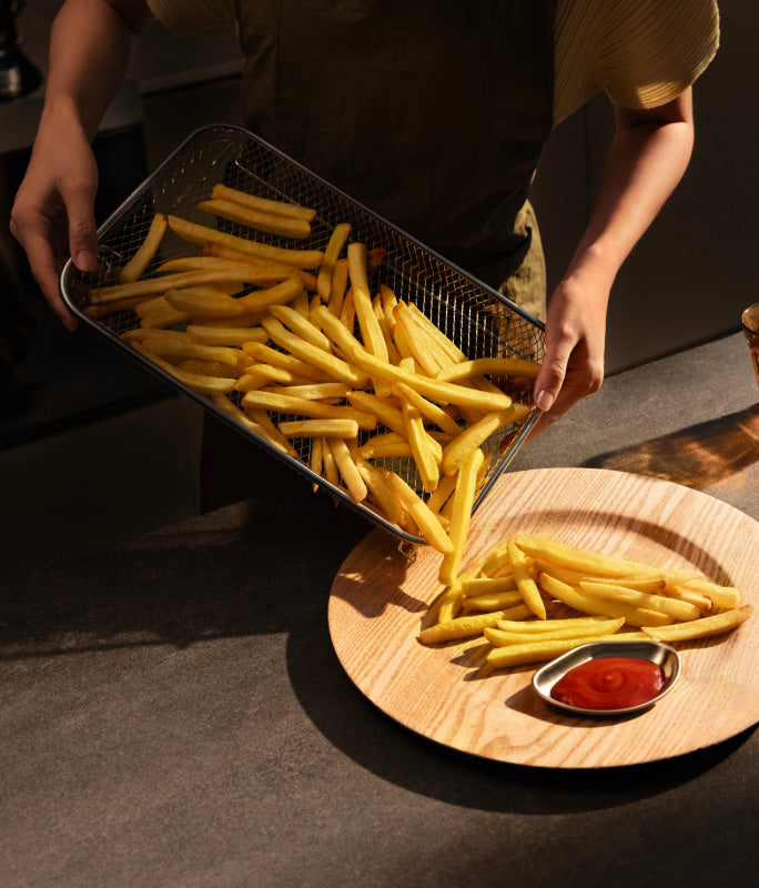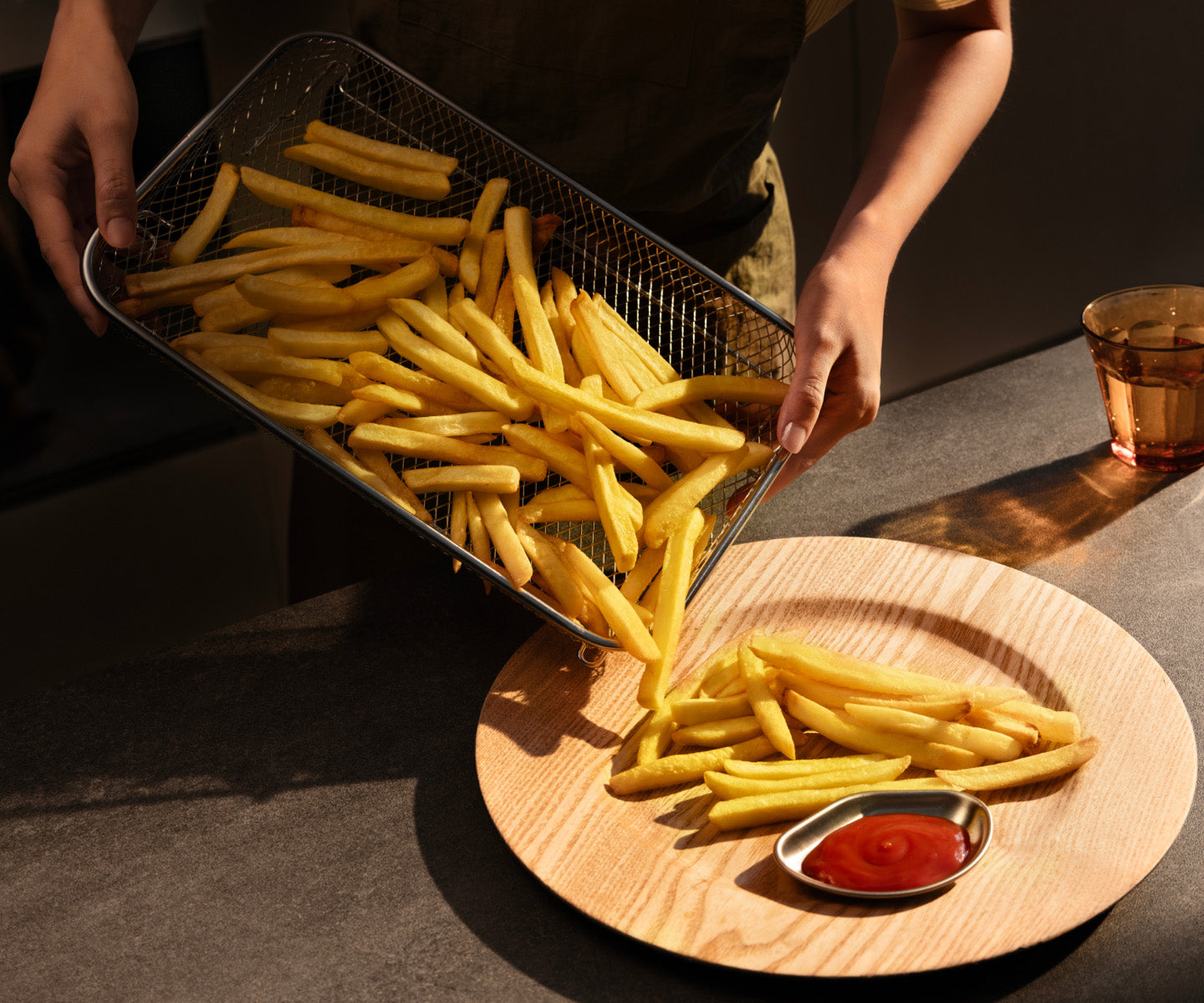 *80% mniej oleju: test przeprowadzono na mrożonych frytkach, w porównaniu z frytkami smażonymi tradycyjnie w głębokim tłuszczu. Dane z naszego wewnątrzzakładowego laboratorium.
