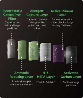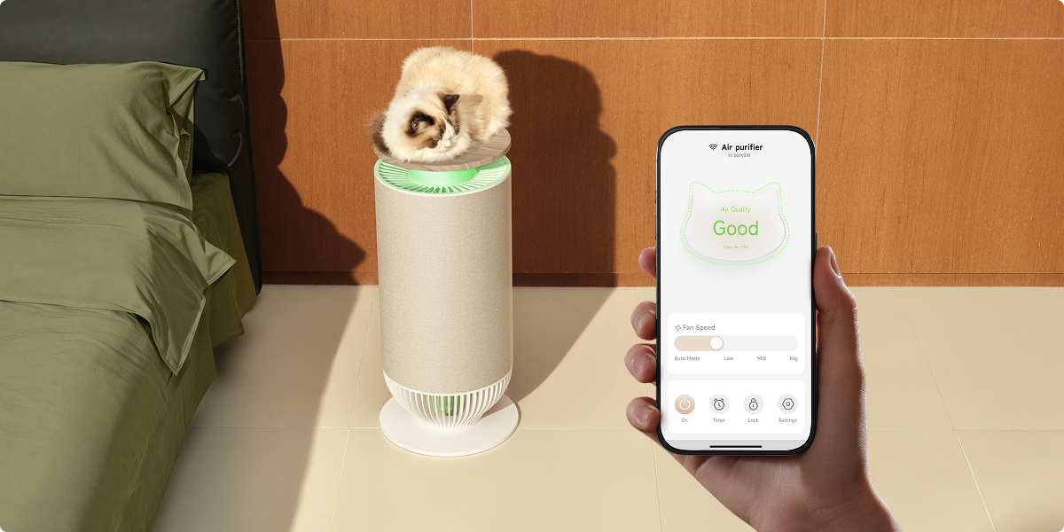 *Usuwanie 95% sierści unoszącej się w powietrzu: Na podstawie wewnętrznych testów wydajności oczyszczacza w zakresie wychwytywania sierści. Nr raportu z testu: KH-IR-202502924. Wyniki mogą się różnić w zależności od warunków środowiskowych i rzeczywistego użytkowania.
