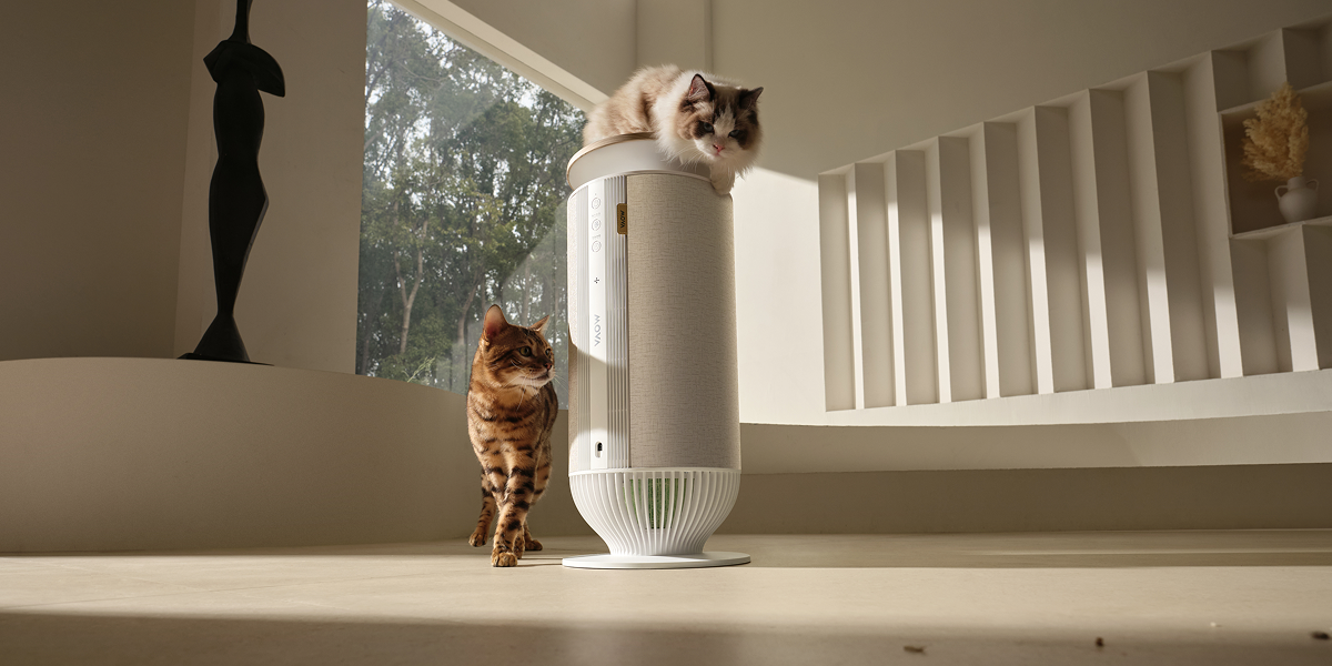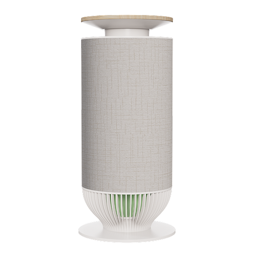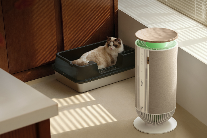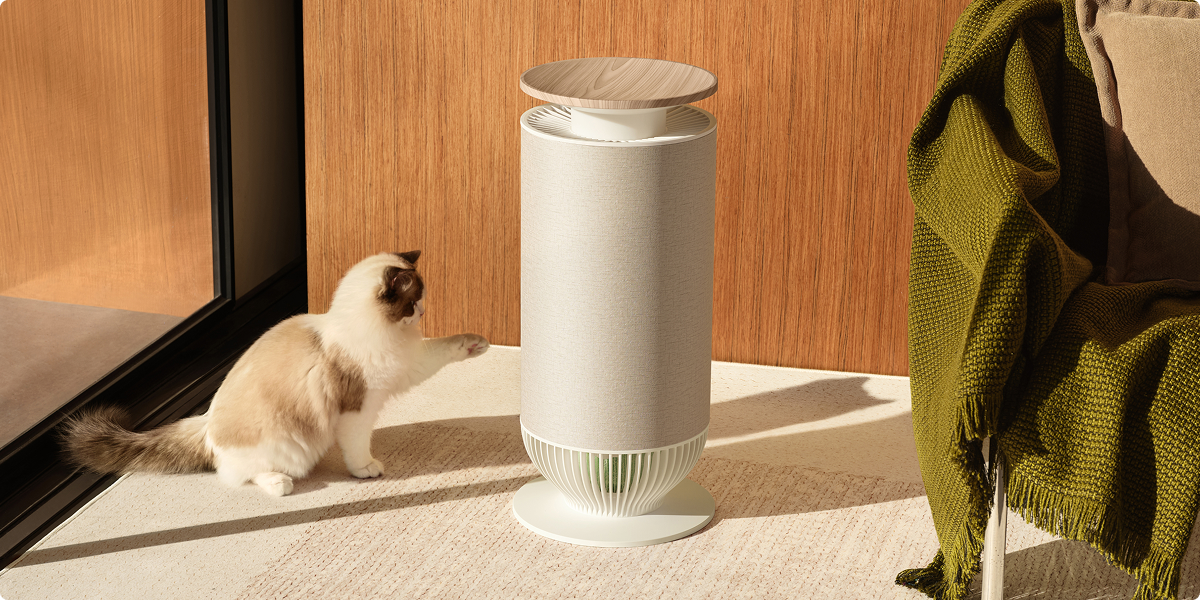 Magnetyczne nakładki* pozwalają zmieniać kolory i faktury, aby dopasować urządzenie do wystroju wnętrza. Zaprojektowany tak, by idealnie wtapiać się w pomieszczenie, pełni funkcję oczyszczacza powietrza, legowiska dla kota i stylowego mebla – wszystko w jednym.