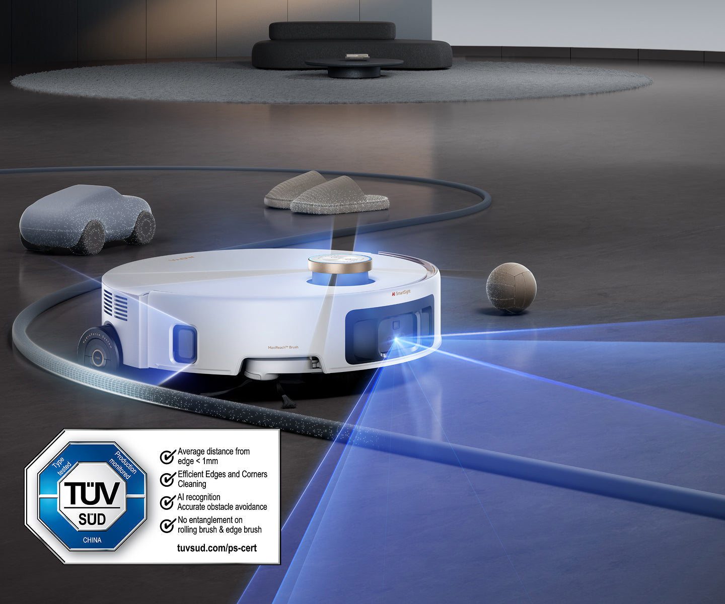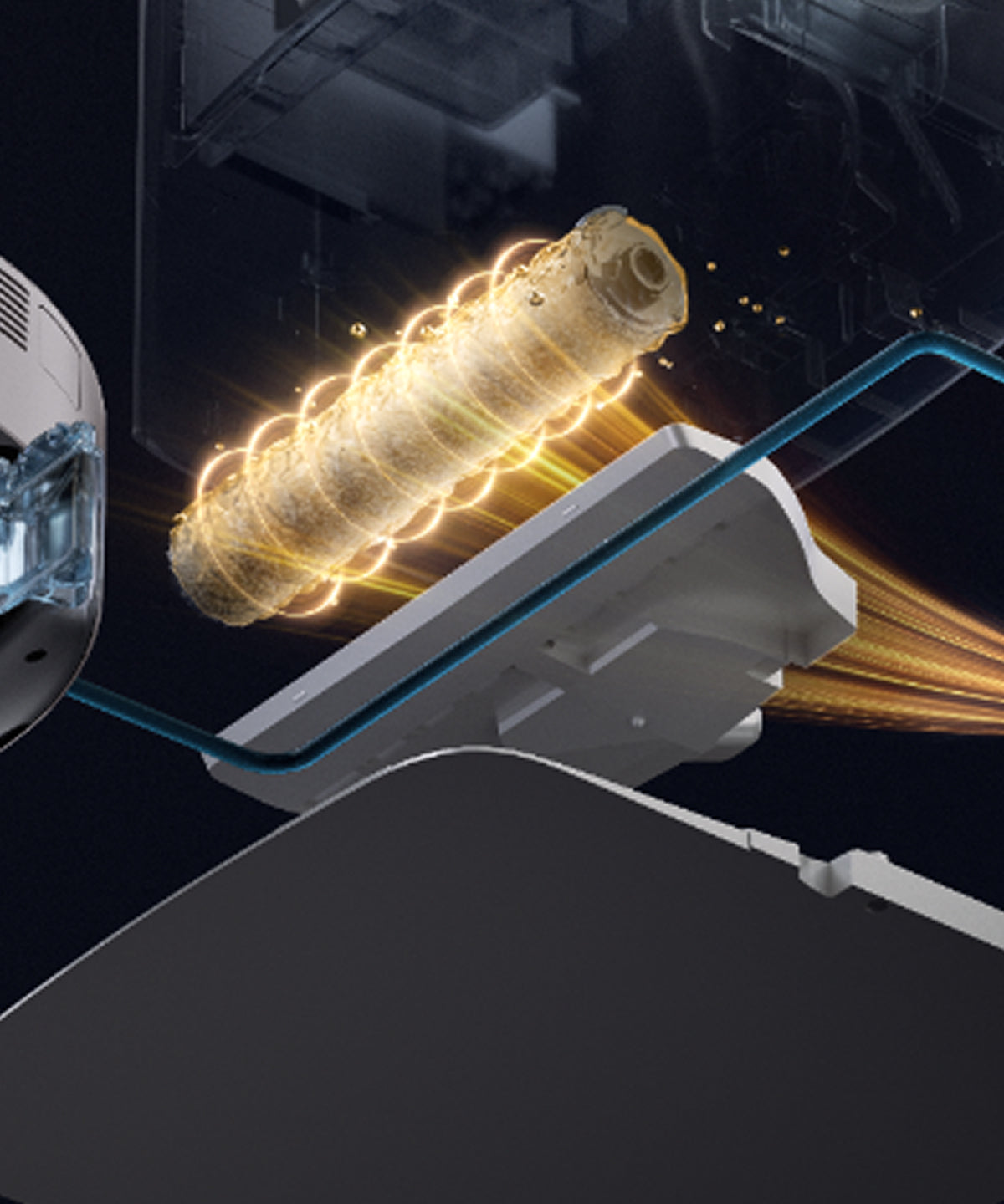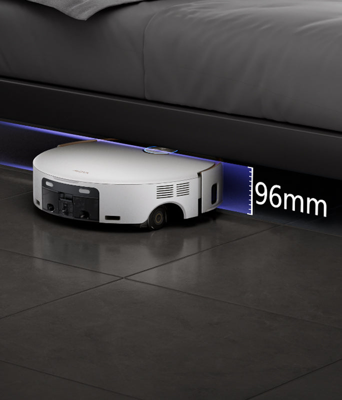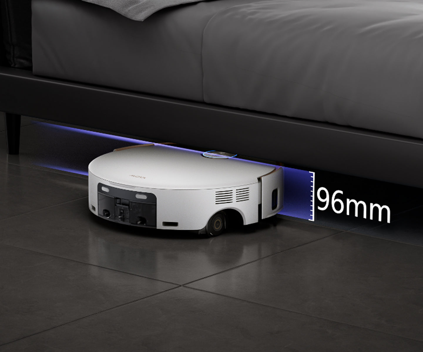 Robot Z60 Ultra Roller Complete wyposażono w chowany czujnik LiDAR o milimetrowej dokładności, który dostosowuje się do Twojej przestrzeni – unosi się w otwartych obszarach i opuszcza w niskich. Po schowaniu, ultracienki korpus o wysokości 96 mm* z łatwością wsunie się pod sofy i łóżka, docierając tam, gdzie ukrywa się kurz, aby zapewnić kompleksowe sprzątanie całego domu – nawet w trudno dostępnych miejscach.