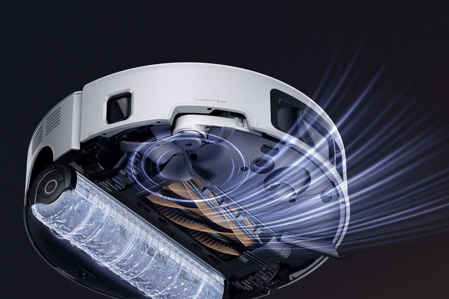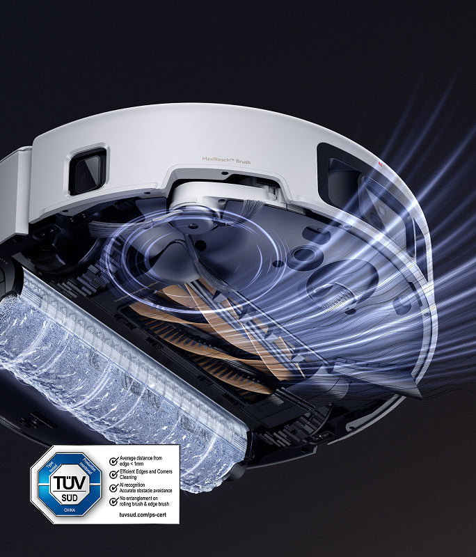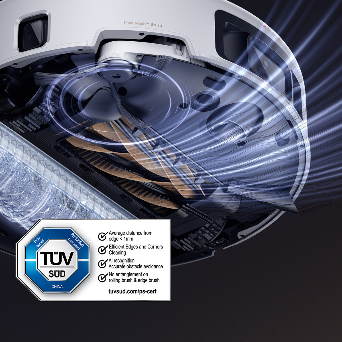 Dzięki technologii MaxiReach™ szczotka boczna dynamicznie się wysuwa, aby usunąć kurz, włosy i zanieczyszczenia, co umożliwia wyczyszczenie obszarów przy krawędziach na poziomie 99,99%